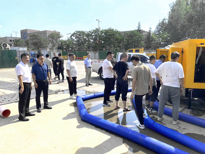 为应对防汛抗旱及台风等恶劣天气的影响,7月7日,集团自吸式车载移动泵站投入到项目使用。各项目部迅速组织相关技术人员学习泵站操作规范,并积极开展了实操演练活动。集团副总经理李正春参加活动。