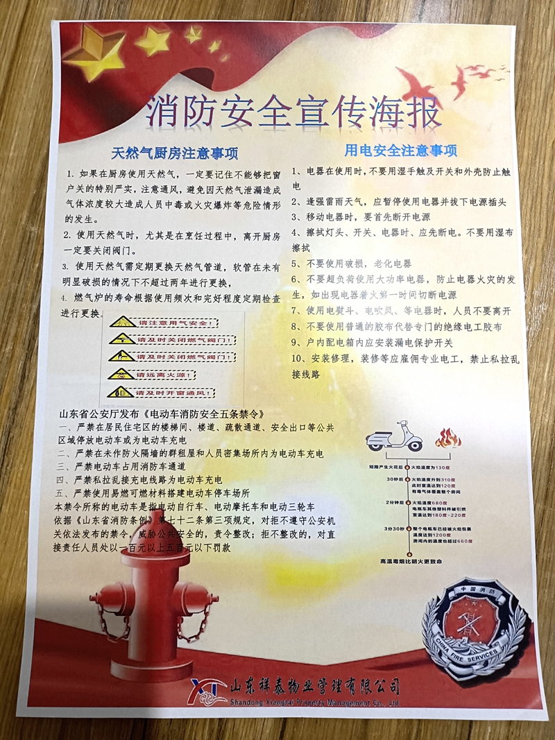 6月17日,为贯彻落实好集团公司安全生产月工作要求,人和蓝湾小区开展消防安全主题活动。人和商管公司、安全品控部和山东祥泰物业公司相关负责人参加。 活动当天,物业消防负责人员向详细讲解了灭火器、消防栓及消防水带等器材的使用方法,组织开展了火情处置消防演练,并在小区发放安全宣传单,切实让全体物业