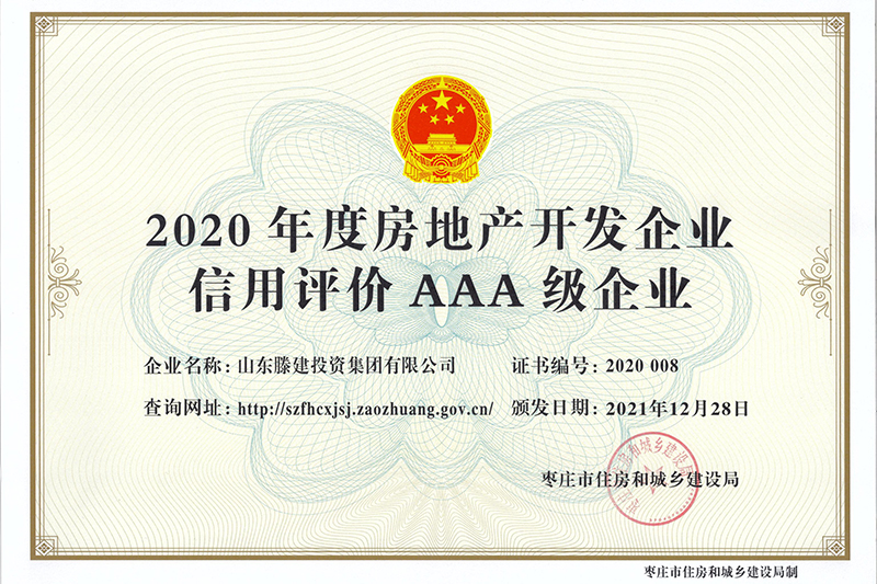 近期,枣庄市住房和城乡建设局发布了2020年度全市房地产开发企业信用等级评定结果。九游(中国)有限公司凭借在企业客观信用能力、经营信用情况、社会信用等方面出色的综合实力,荣获2020年AAA级房地产开发企业最高信用等级。房地产开发企业信用评定是枣庄市住房和城乡建设局依据《枣庄市房地产开发企业信用评价实施细则
